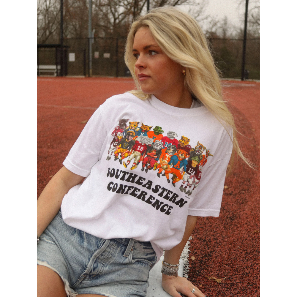 Get ready to cheer on the entire Southeastern Conference in the SEC Family Character Comfort Colors T-Shirt! Featuring a lineup of iconic SEC mascots in a fun, detailed design, this tee captures the excitement and unity of the conference. The Comfort Colors fabric is pre-washed for that soft, vintage feel fans love, and it offers a relaxed, easygoing fit perfect for all-day wear. The white background makes the bold, vibrant mascot artwork stand out in any crowd. Whether you're heading to a game, road-tripping through the South, or just repping your teams from home, this shirt keeps your SEC spirit front and center. Made with high-quality cotton, it’s both durable and breathable—ideal for any season. Show your pride in every SEC school with a tee that celebrates the full conference in style!