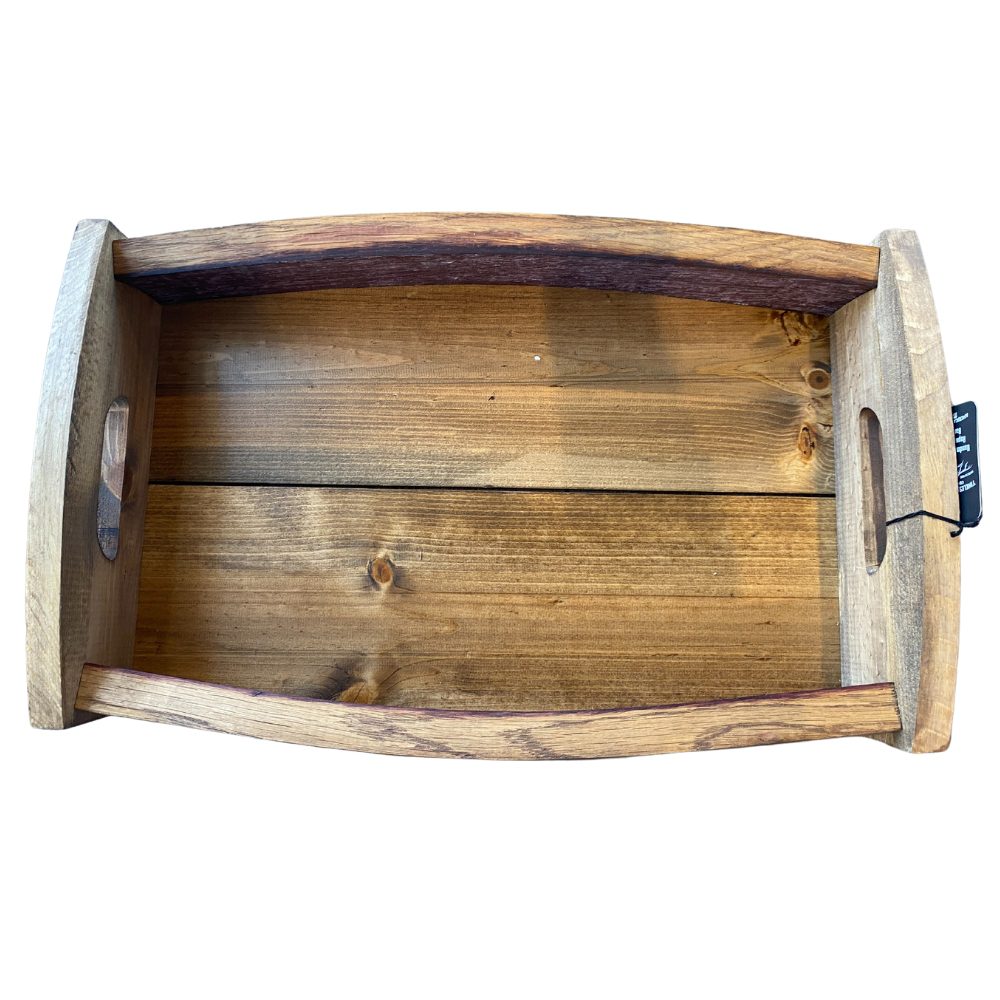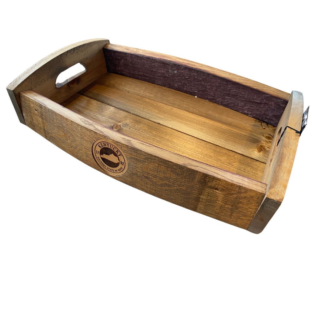 Host with heritage using this handcrafted Kentucky Barrel Stave Serving Tray. Once part of a Kentucky bourbon barrel, these staves are now beautifully transformed into a serving tray with purpose and style. The iconic Kentucky silhouette and “1792” engraving make this a true conversation piece. Designed for both decor and utility, it’s ideal for displaying bottles, serving hors d'oeuvres, or simply adding rustic charm to your space. The mix of charred oak and rich coloring makes it visually striking and highly durable. Its thoughtful design features comfortable side handles and smooth finished edges. Bring a bit of Kentucky’s bourbon tradition into your home with this elegant serving solution.