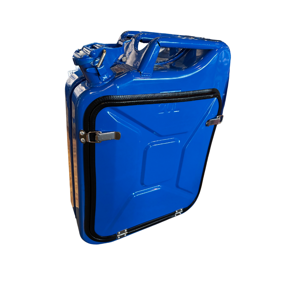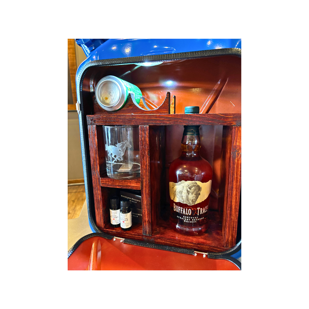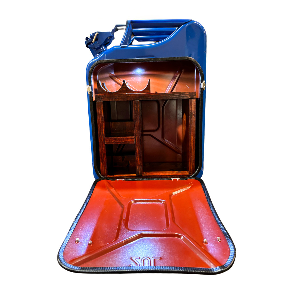 Perfect for the die-hard sports fan or tailgate MVP, the Vintage Gas Can Travel Bar is a game day essential. Housed in a repurposed, vintage gas can with a bold blue finish, this Kentucky-made portable bar stores your bourbon, bitters, and more with flair. The interior features custom woodwork designed for durability and style. With built-in LED lighting and a secure lid, your drinks travel in style and safety. Ideal for tailgates, campsites, or garage lounges, this bar is as functional as it is conversation-worthy. Compact yet durable, it’s made to go wherever the good times roll.