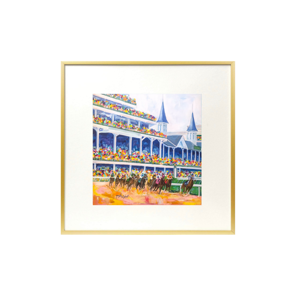 This Kayla Weber "The First Turn" print shows the iconic view of of Churchill's Twin Spires and first turn.