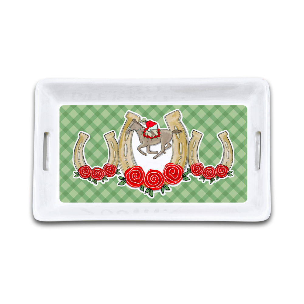 Add a bit of Kentucky Derby flair to your hosting lineup with this Horseshoe Mini Serving Tray. The distinctive horseshoe outline makes it instantly recognizable and perfect for equestrian-themed tablescapes or race-day celebrations. It’s small enough to fit on crowded buffet tables yet roomy enough to hold bite-sized finger foods or condiments. Durable construction ensures it stands up to regular use while keeping its shape and finish. Use it on its own or pair it with larger platters for a coordinated look that honors Derby tradition. Its neutral aesthetic works well with casual and more polished place settings alike. Great for anyone who loves classic Kentucky style and thoughtful entertaining pieces.