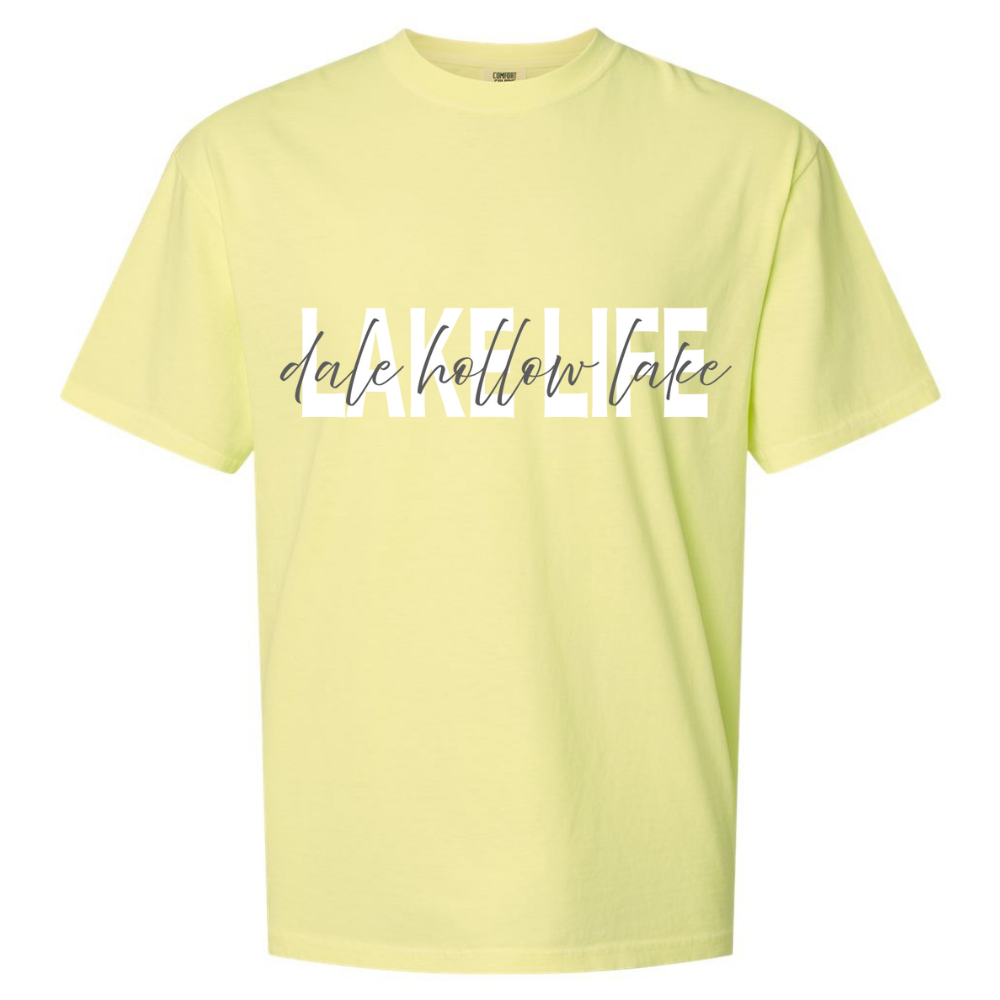 Let everyone know where your heart belongs with this stylish Dale Hollow Lake Life Comfort Colors T-Shirt. Featuring bold white “LAKE LIFE” lettering front and center, with a simple “Dale Hollow Lake” written across in, it’s the perfect balance of lake-day energy and laid-back charm. This design speaks volumes—showing off your love for the water in a way that feels both modern and timeless. Made with Comfort Colors’ signature soft-washed cotton, it feels like your favorite tee from the very first wear. Whether you're casting a line, watching the sunset, or cruising across the water, this shirt belongs in every lake lover’s weekend rotation. Wherever the season takes you, this tee keeps your lake spirit right where it belongs: close to the heart.