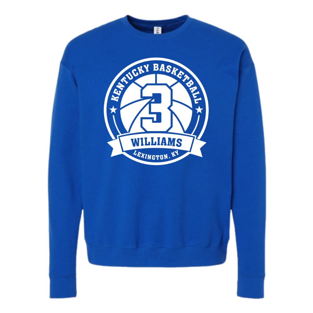 The Kam Williams 3 Kentucky Basketball Badge Crewneck brings tradition and modern style together in one standout design. The bold badge design features basketball detailing that reflects the history and intensity of Kentucky basketball. Kam Williams’ number 3 is prominently displayed, giving the sweatshirt a strong player-focused identity. Every element works together to create a design that feels official, confident, and fan-ready.