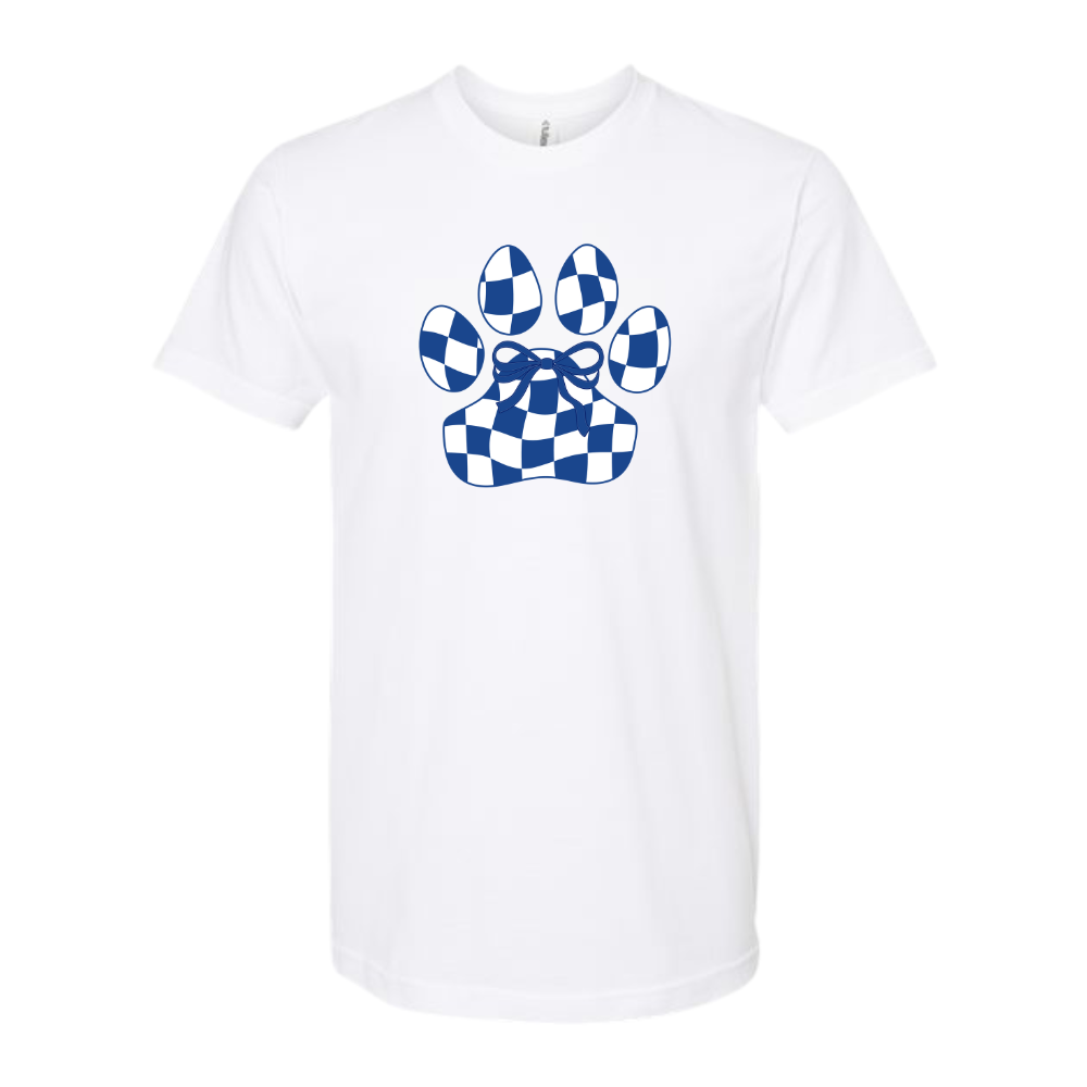 The Checkerboard Paw and Bow T-Shirt combines bold pattern with delicate detail. Featuring a paw silhouette filled with a blue and white checkerboard, the design feels sporty and timeless. A dainty bow adds a playful, feminine finishing touch. The soft, lightweight fabric makes it ideal for everyday comfort. Its relaxed fit works well for dressing up or down. Wear it solo or layered for an effortless look. This tee is perfect for anyone who loves team pride with a sweet, stylish edge.