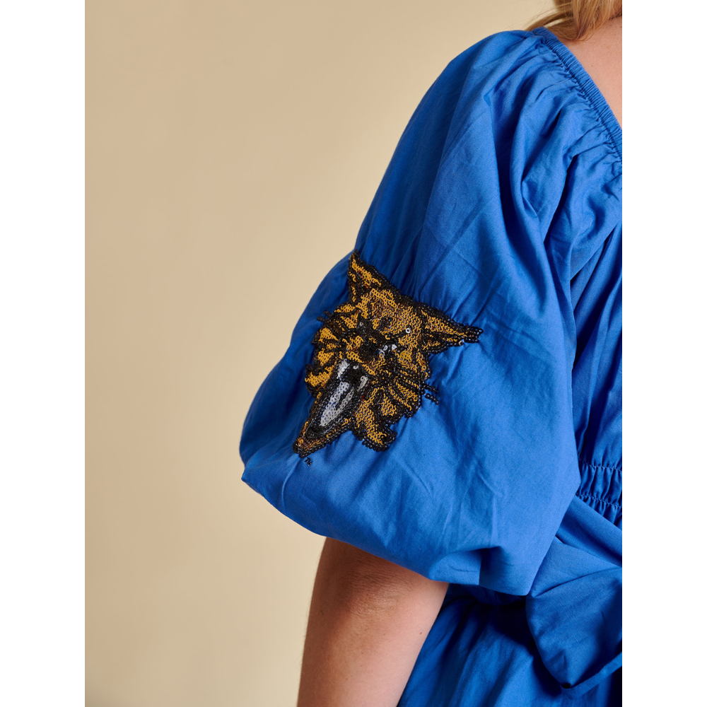 Dazzle the crowd in our Wildcat Sequin Puff Sleeve Dress, where school pride meets runway-ready style. The rich royal blue base is brought to life with intricate gold and black sequin wildcats that glimmer with every step. Puffy sleeves and a square neckline add drama, while the smocked waist ensures a flattering, stay-put fit. This dress is perfect for game day, homecoming, or any event where spirit and style are both required. It’s equal parts playful and polished—just like your favorite team moments. Add bold earrings or a simple sneaker to finish the look. With this dress, every day is a victory.