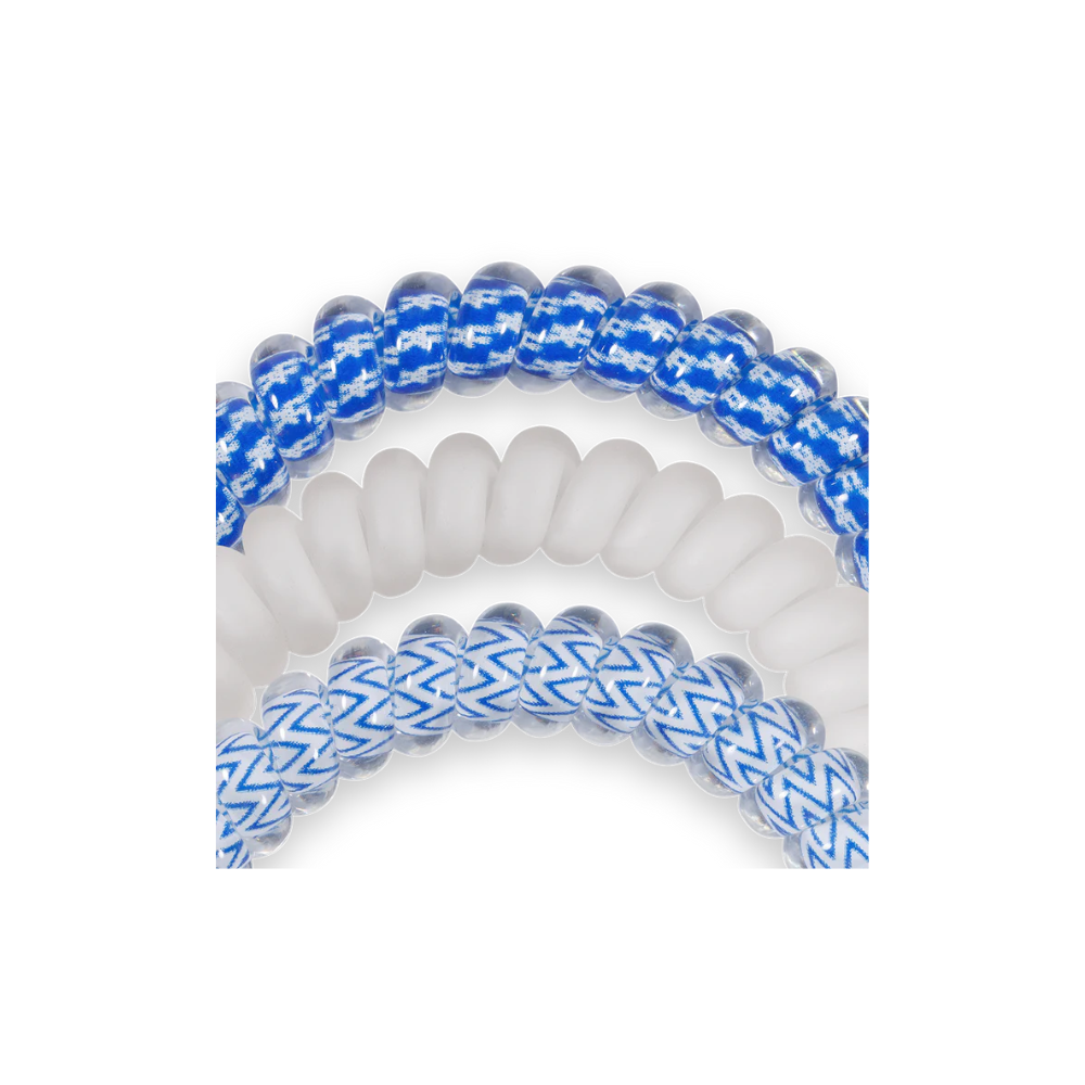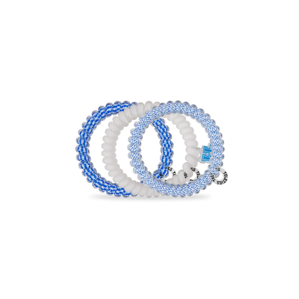 Grab a new, updated set of Go Big Blue! Small Teleties. These 3 ties are small in size but big on performance. Crafted with TELETIES’ innovative no-rip, strong-grip technology, these ties offer the perfect hold for fine to medium hair without pulling or snagging. Gentle on strands, they help avoid breakage, headaches, and those dreaded crease lines that set your look back. The vibrant Kentucky blue and white colorway adds a sporty flair that transitions seamlessly from the gym to class to lounging around. And when not anchoring your hairstyle, they stack as fashionable bracelets for a fun, collegiate twist.