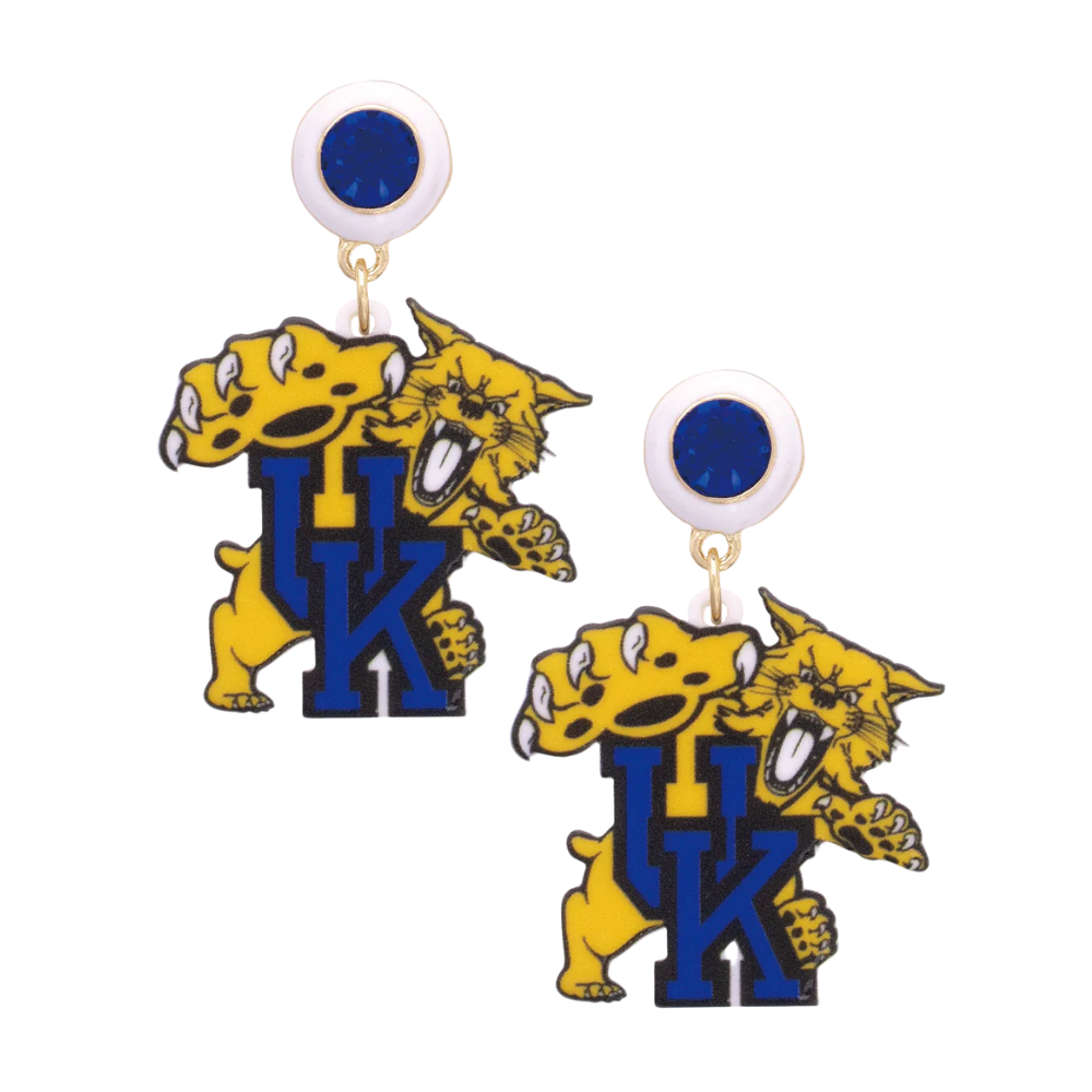 Show off your team spirit with these UK Wildcats Resin Mascot Dangle Earrings — the perfect finishing touch for any Kentucky fan’s game day look. Featuring the beloved Wildcat mascot in bold blue and white, these earrings capture the pride that defines Big Blue Nation. The detailed resin design adds a fun, sporty flair that’s equal parts playful and polished. Lightweight and comfortable to wear all day, they’re ideal for tailgates, watch parties, or casual everyday outfits. The dangle style brings movement and energy that catches the light — and everyone’s attention. Whether you’re cheering courtside or from home, they’ll make sure your loyalty shines bright. Add these earrings to your game day collection and show you’re Kentucky proud from head to toe.
