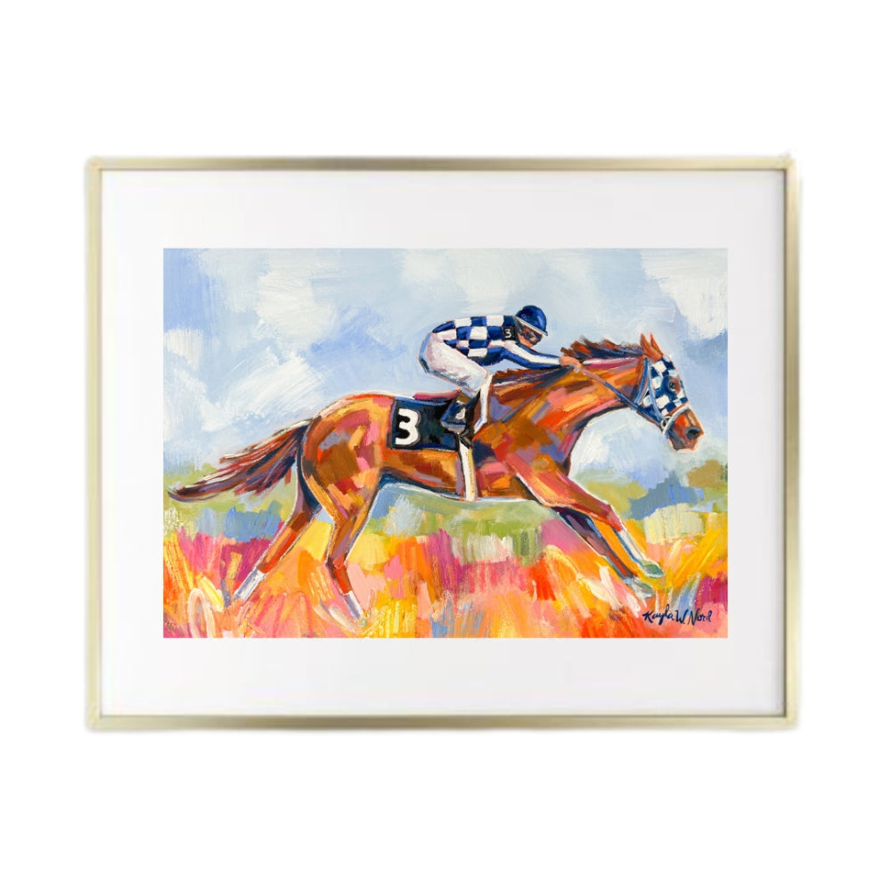 Esta pieza abstracta y colorida es parte del último lanzamiento de Kayla Weber, para el Derby número 150. Esta pintura presenta una pintura abstracta de Secretary con sus pinceladas abstractas características y una textura acrílica espesa.