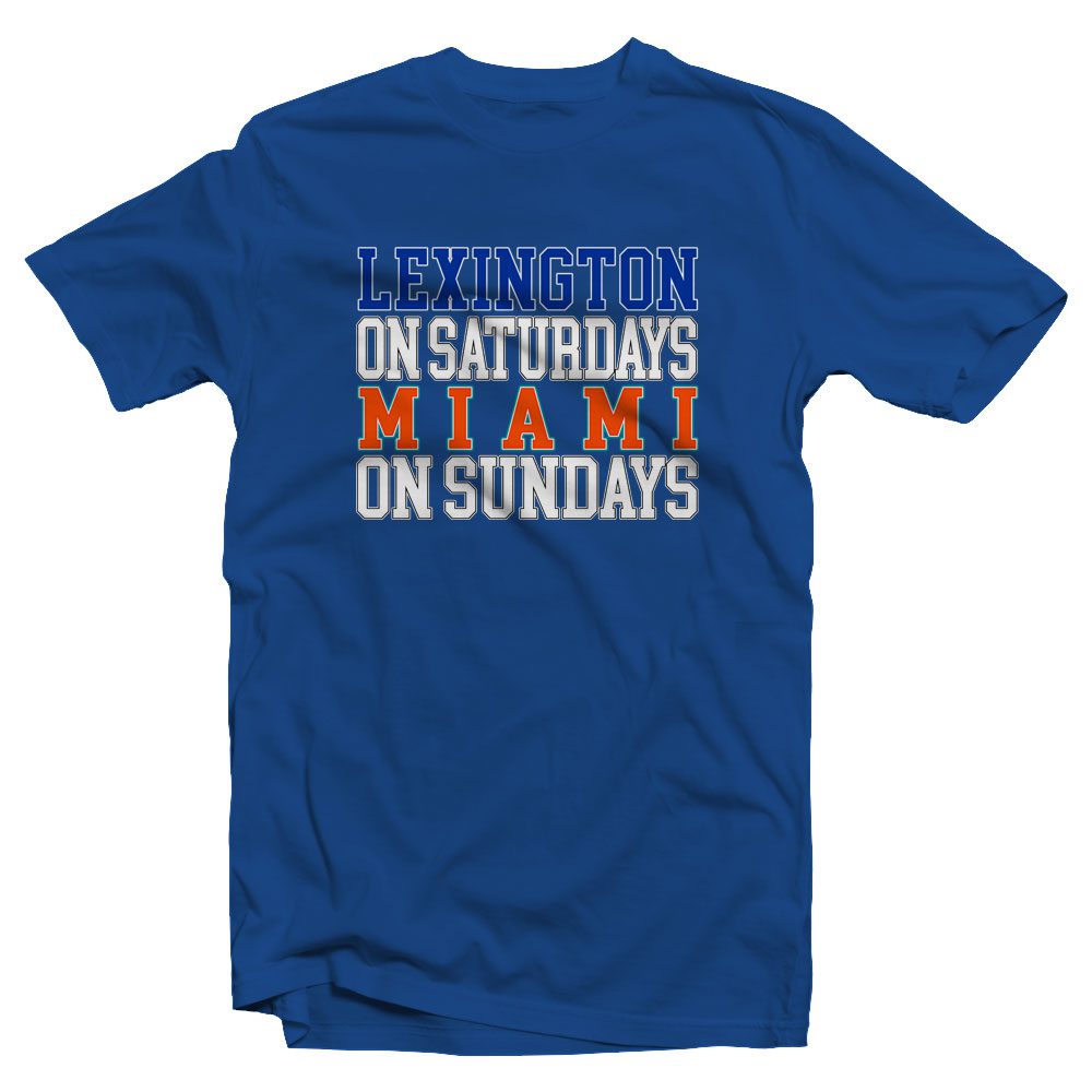 ¡Duplica tu espíritu del día de juego con esta camiseta real "Lexington los sábados, Miami los domingos"!
