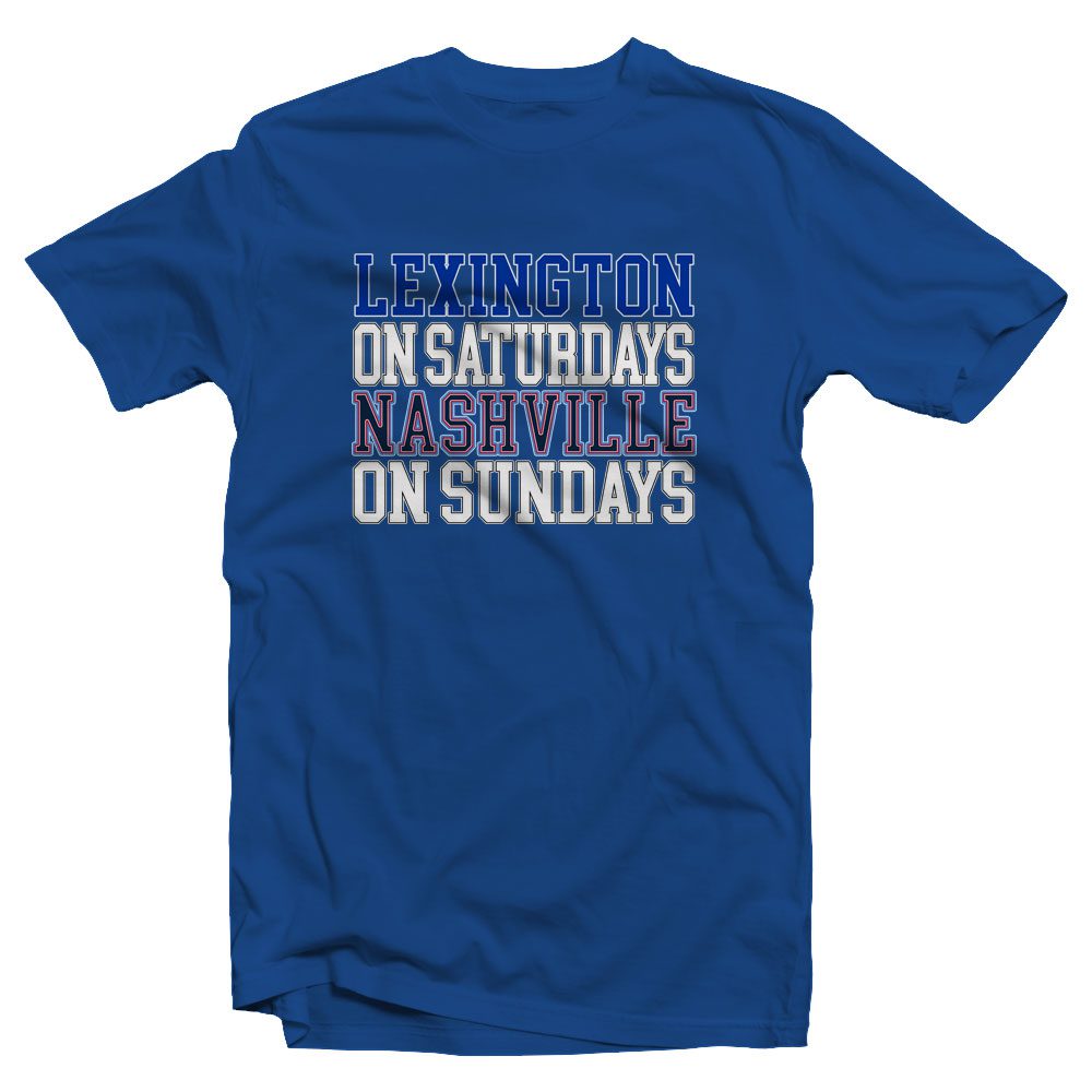 ¡Duplica tu espíritu del día de juego con esta camiseta real "Lexington los sábados, Nashville los domingos"!