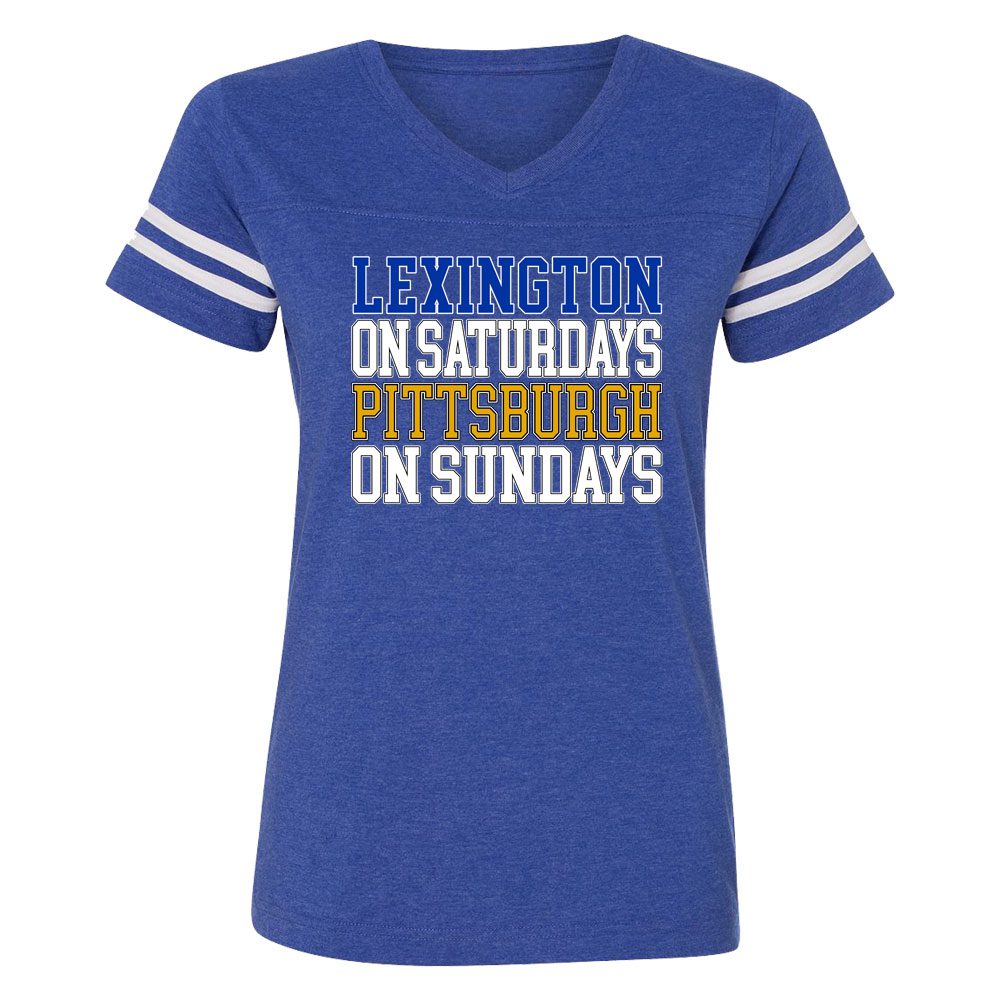 ¡Duplica tu espíritu de día de juego con esta camiseta de cuello en V para mujer "Lexington los sábados, Pittsburgh los domingos"!