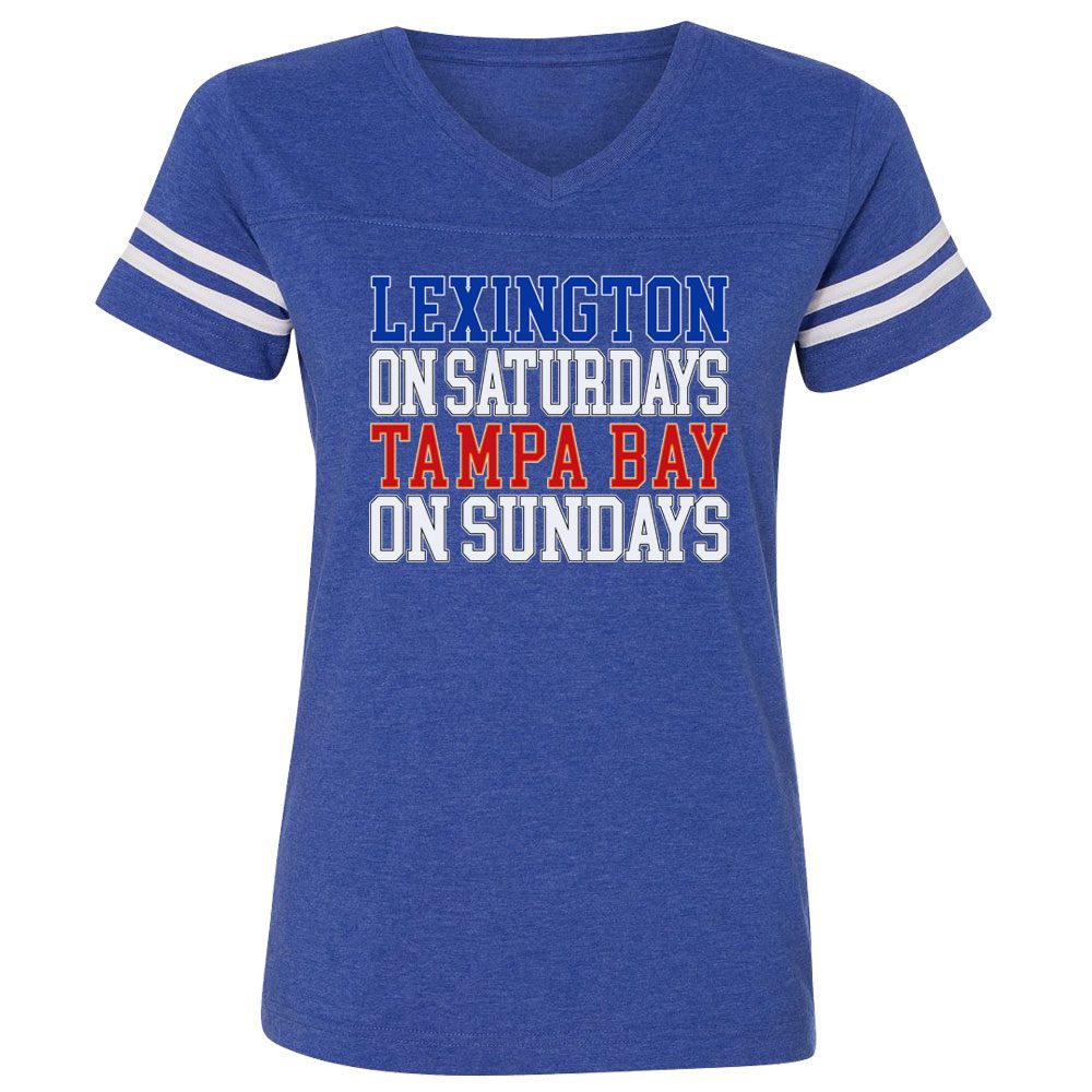 ¡Duplica tu espíritu del día de juego con esta camiseta de cuello en V para mujer "Lexington los sábados, Tampa Bay los domingos"!
