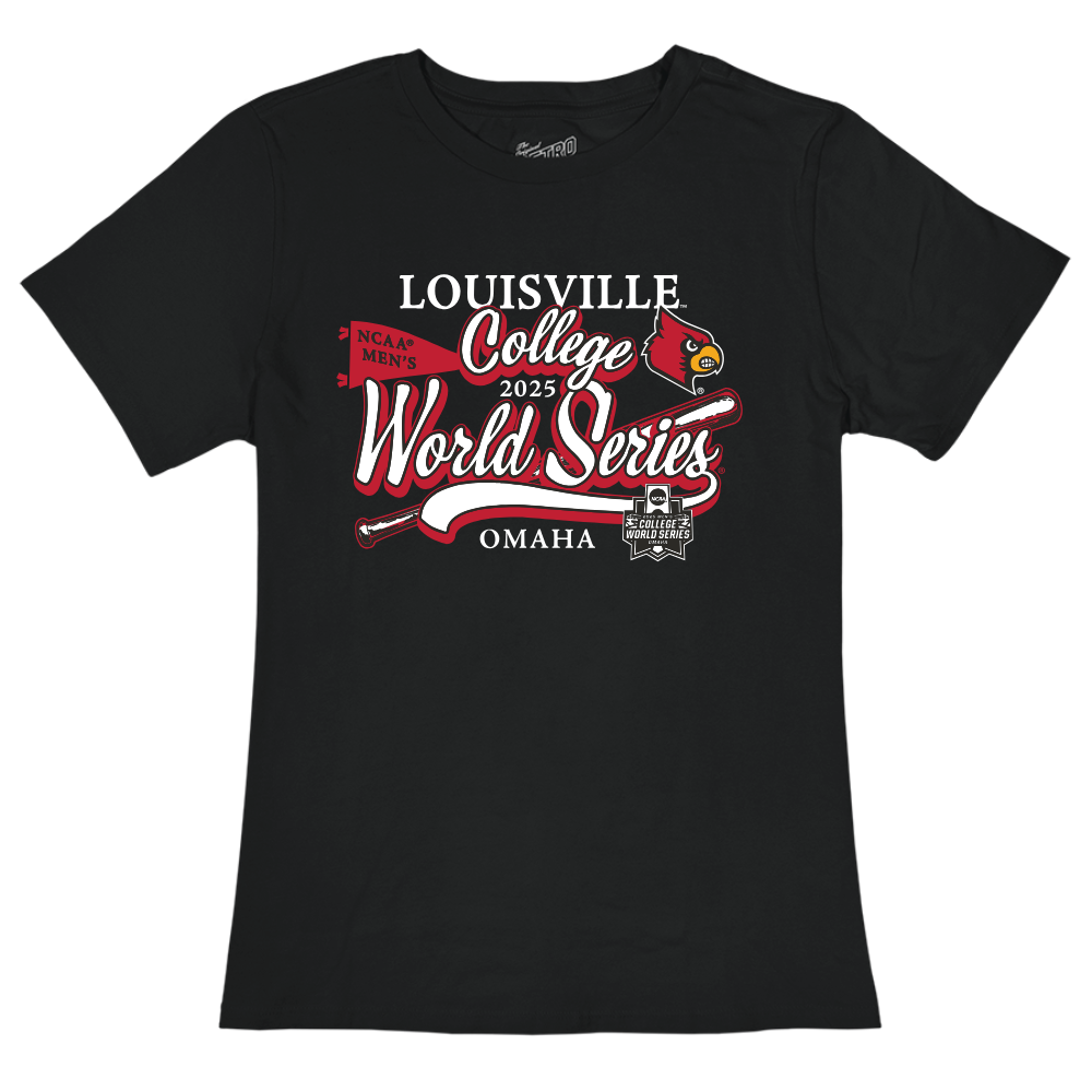 The road to Omaha runs through Louisville, and this Louisville Cardinals 2025 World Series T-Shirt is the best way to commemorate that run! Featuring bold 2025 College World Series graphics and the Cardinals’ unmistakable colors, it's a celebration of grit, hustle, and heart. The front design blends vintage flair with modern energy—just like the team itself. Lightweight and comfortable, it's made to be worn on game day and every day after. The black base makes the red and white pop, while the bats and CWS badge add a championship touch. Show your support loud and proud wherever you go.